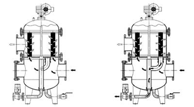 正常過(guò)濾狀態(tài)      濾芯反沖洗狀態(tài)       HD-DL III型反沖洗式自潔式過(guò)濾器